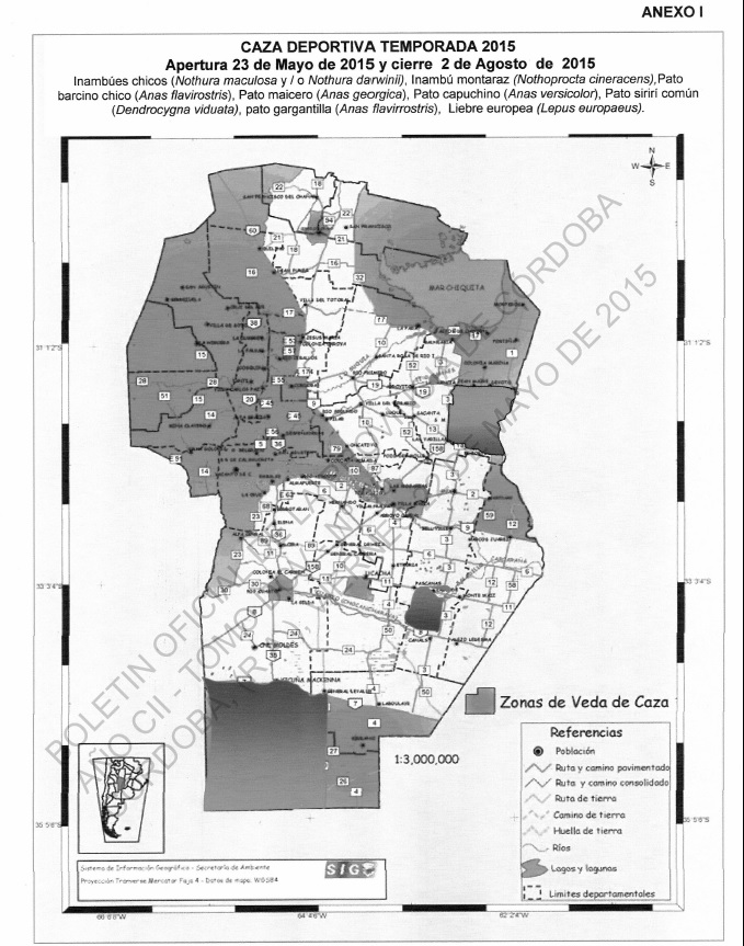 Texto de la Resolución 223 del 18 de Mayo estableciendo el Reglamento de Caza Mayor y Menor 2015 en la Provincia de Córdoba.