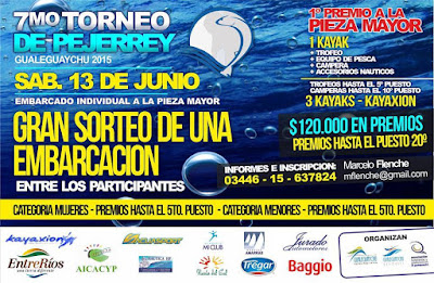 El día 13 de junio de 2015, sobre aguas del Rio Uruguay, en la localidad de Gualeguaychú Provincia de Entre Ríos. Se realizara el 7mo. Torneo de Pesca de Pejerrey, modalidad embarcado individual.