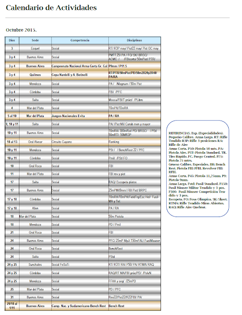 En el Notifat 170, la Federación Argentina de Tiro dio a conocer el calendario de actividades de sus entidades federadas, previstas para el próximo mes de octubre.