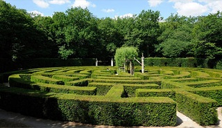 Siete mil plantas de arbustos boj buxus sempervirens cubren una superficie de casi dos hectáreas, formando un gigantesco libro abierto con senderos que dibujan el nombre del escritor, sus símbolos preferidos y las iniciales de María Kodama. El espejo, el reloj de arena, la cara de un tigre, el bastón de un ciego y hasta la cinta de Moebius forman parte del recorrido de este laberinto borgiano.