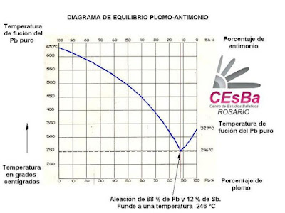 La aleación plomo-antimonio funde, según su composición, entre los 246°C hasta los 327°C (ver diagrama de equilibrio de la aleación).