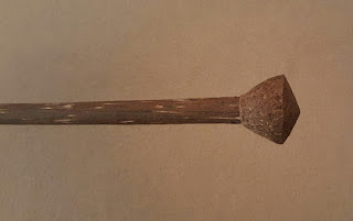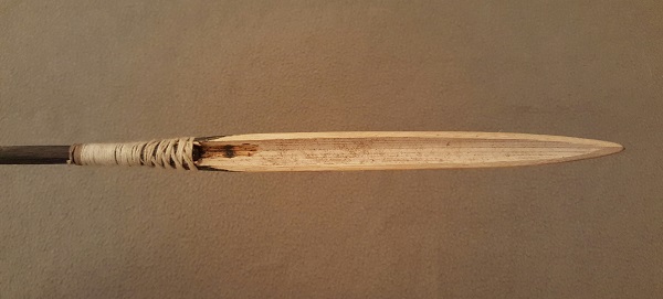Flechas: Son a mi entender la parte más vistosa e interesante del equipo. Están confeccionadas en un tipo de caña muy pareja, con nudos muy separados entre sí. Tienen un prolijo trabajo de enderezado y pulido. Su diámetro es de 1,5cm promedio y su longitud es similar a la del arco.