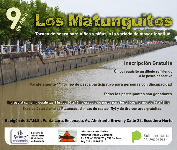 Informes e inscripciones en casa de pesca Matungo en calle 122 nº 2338 Berisso – Tel: (0221) 4528978 o al face matungopesca o el día del torneo desde las 10 hs , en Av Almirante Brown entre las calles 22 bis y 24 (escollera norte ) Punta Lara – Ensenada. Los esperamos